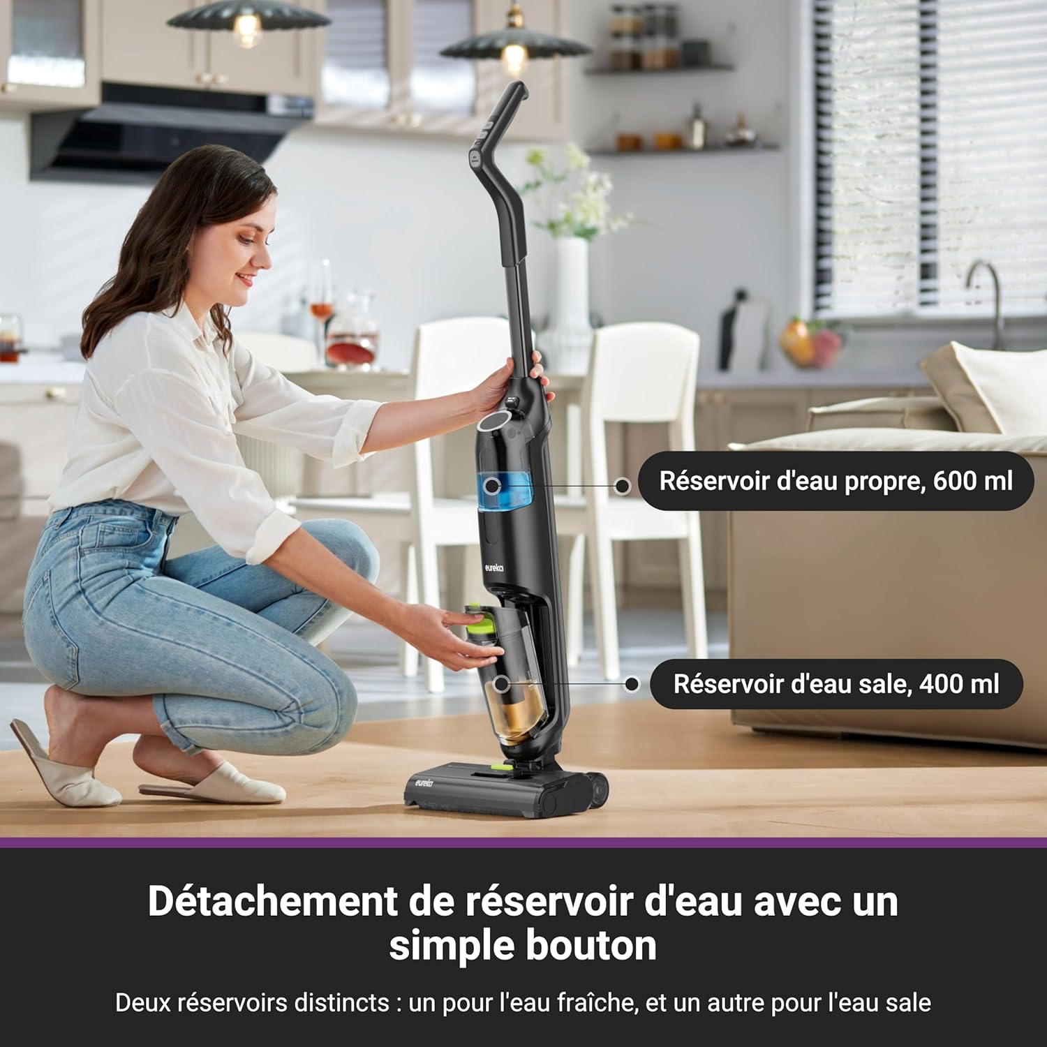 Simplifiez votre routine de nettoyage avec l'Eureka NEW400, conçu pour aspirer et laver simultanément, vous offrant des sols impeccables en un seul passage.