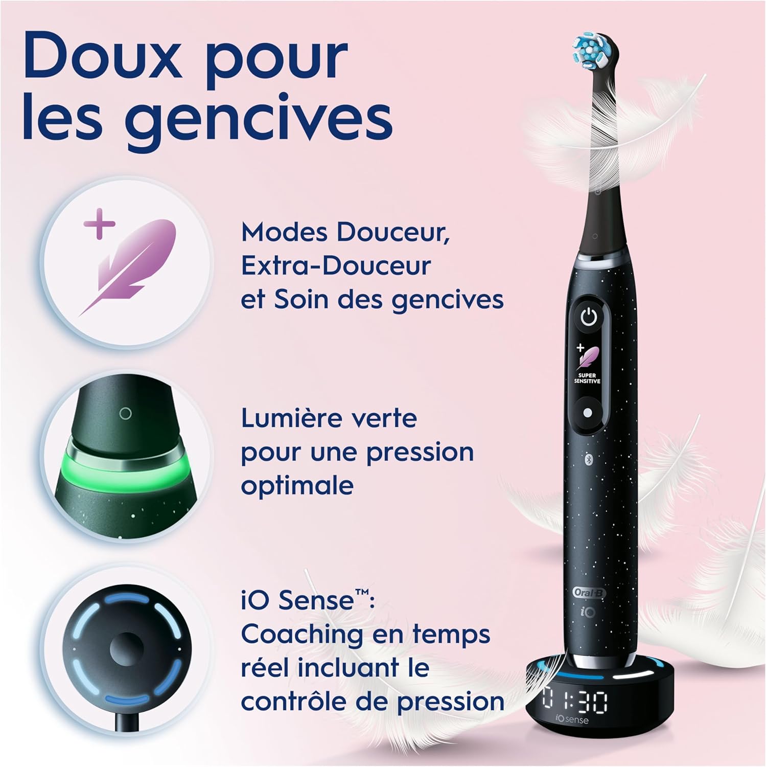 La Oral-B iO Série 10 propose plusieurs modes de brossage adaptés à vos besoins spécifiques, y compris des modes pour le soin des gencives et la douceur. Son capteur de pression intelligent vous avertit si vous appliquez trop de pression, protégeant ainsi vos gencives. De plus, le design élégant et la finition noire apportent une touche de sophistication à votre salle de bain. 🖤🪥