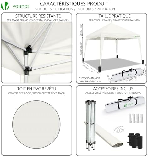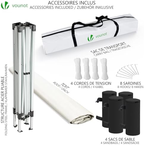 La tonnelle VOUNOT® n'est pas qu'un simple abri ; c'est une invitation à profiter pleinement de l'extérieur, quelles que soient les conditions. Que vous organisiez un barbecue dans votre jardin, teniez un stand sur un marché artisanal, ou cherchiez un refuge ombragé lors d'un festival, cette tonnelle répond présente. Sa conception intelligente allie légèreté et solidité, vous permettant de l'emporter partout où vous en avez besoin. Le déploiement est si intuitif que vous serez prêt en un clin d'œil, laissant plus de temps pour ce qui compte vraiment : profiter de l'instant.