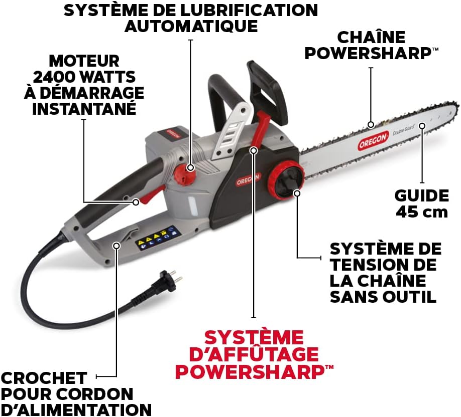 ⚡ La Oregon CS1500 est une tronçonneuse électrique puissante de 2400W, équipée d'un guide de 45 cm et d'un système d'auto-affûtage intégré. Elle est conçue pour offrir des performances exceptionnelles tout en garantissant une facilité d'utilisation optimale. 🌲